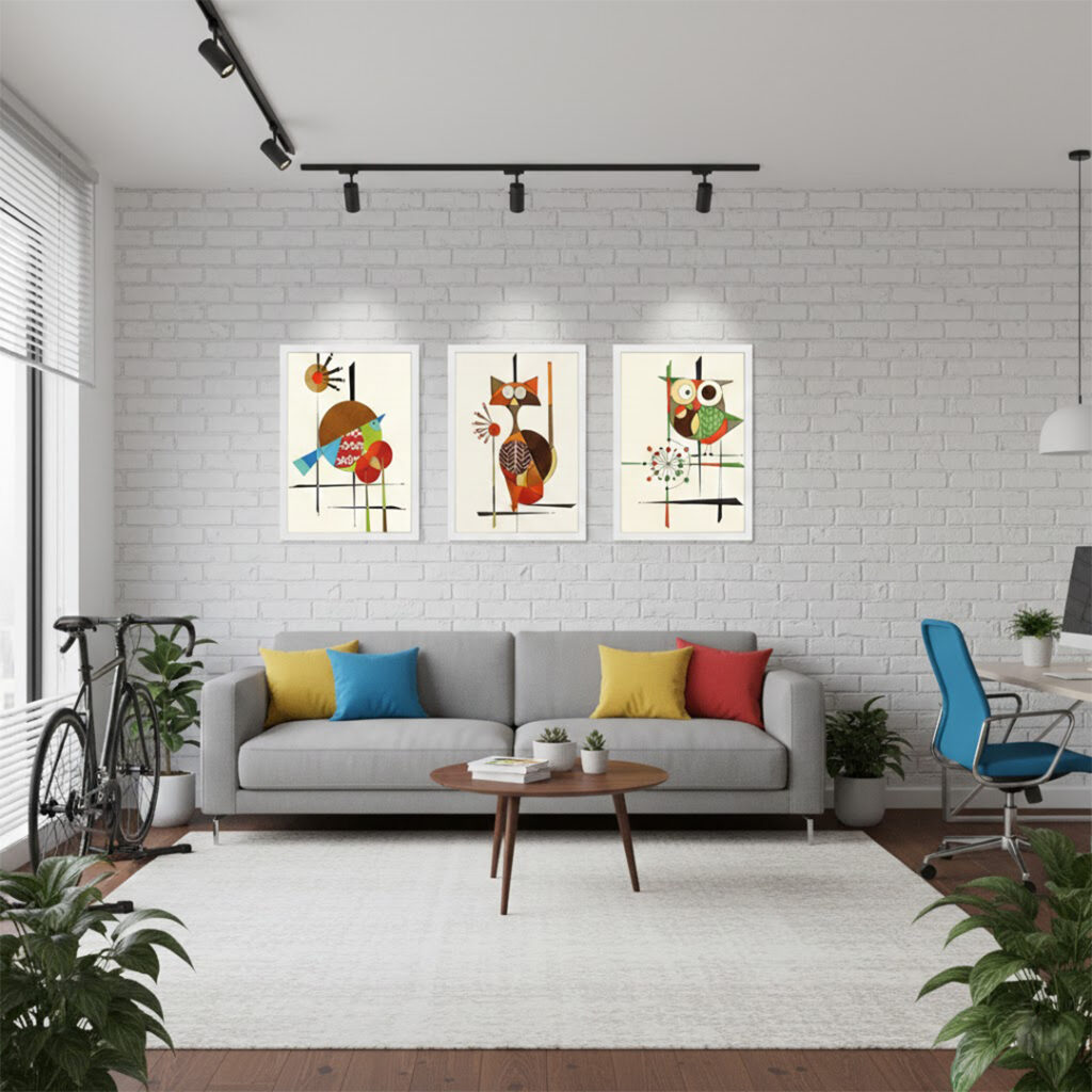 3 Parça Retro Geometrik Sanat Tablo Seti – Beyaz Çerçeveli Modern Salon ve Ofis Duvar Aksesuarı