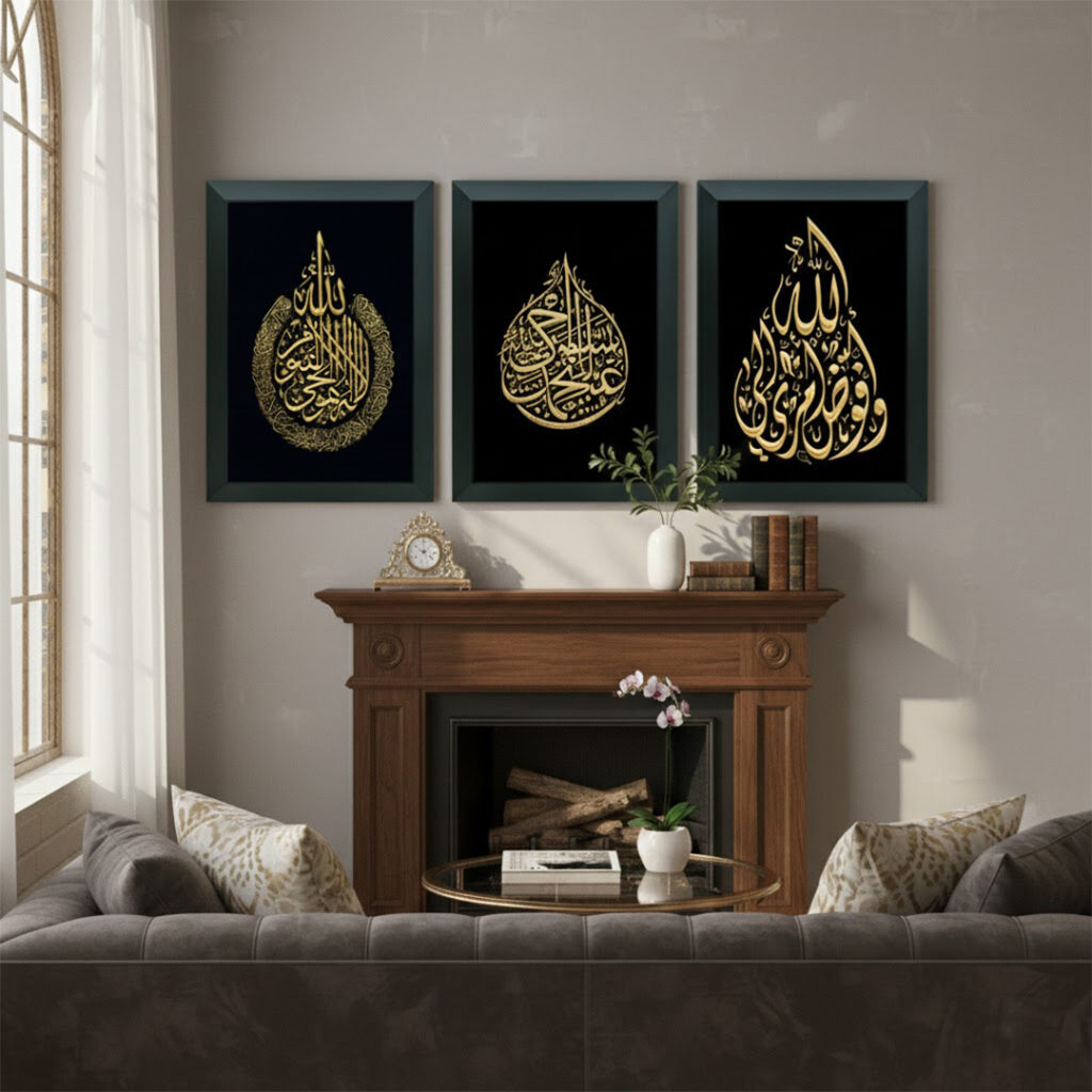 3 Parça Siyah Çerçeveli Dini Tablo Seti – Altın Renk Hat Sanatı (Ayet-el Kürsi, Besmele, Allah-Muhammed Lafzı)