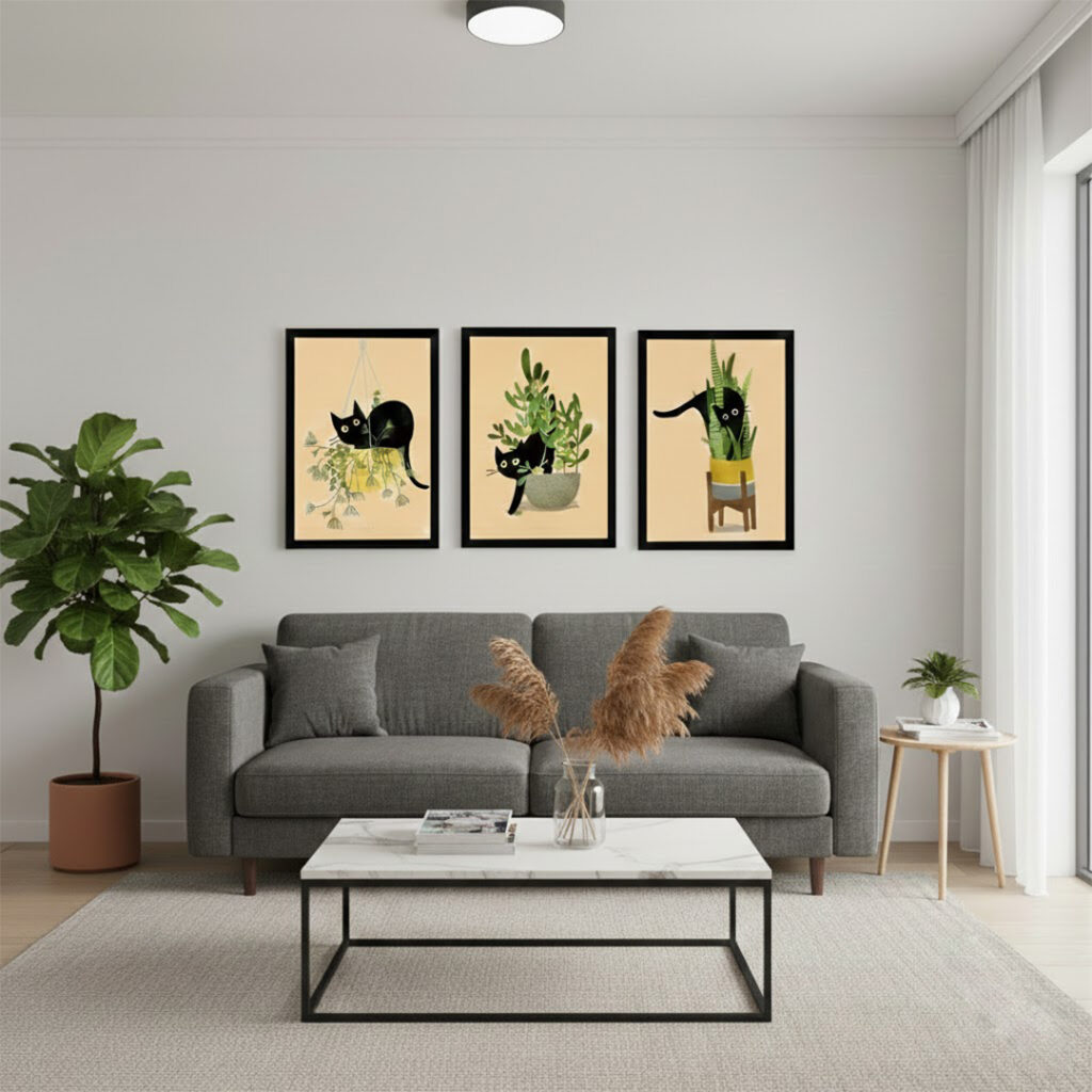 “Yaramaz Kedi Serisi 3 Parça MDF Çerçeveli Tablo – Salon ve Oturma Odası Dekoru”