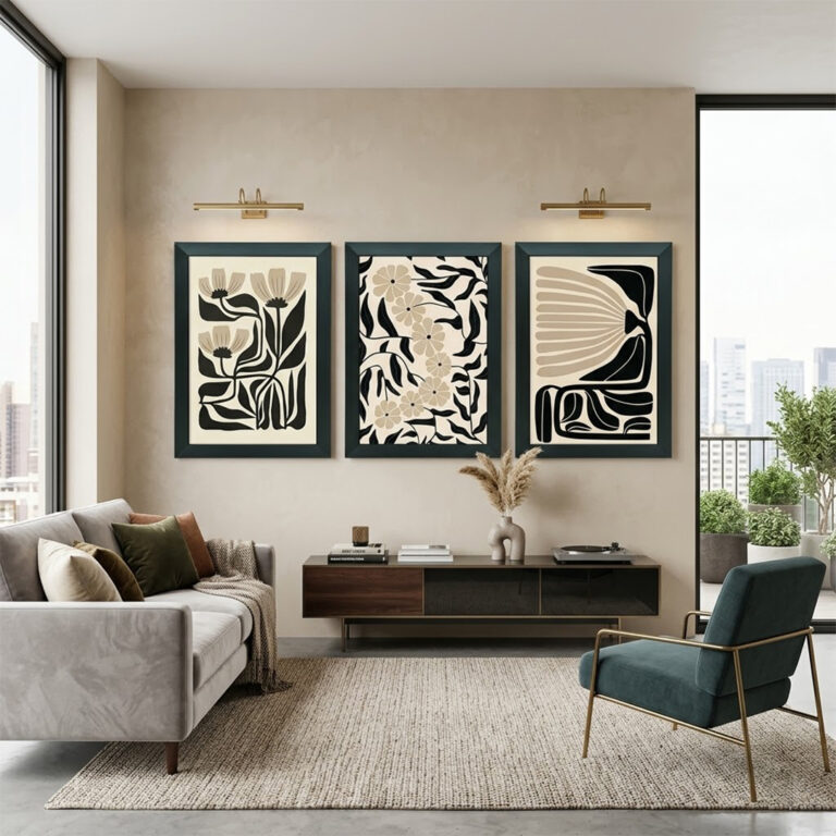 İskandinav Esintili Boho 3’lü Duvar Dekoru – Siyah Çerçeveli Modern Sanat Serisi