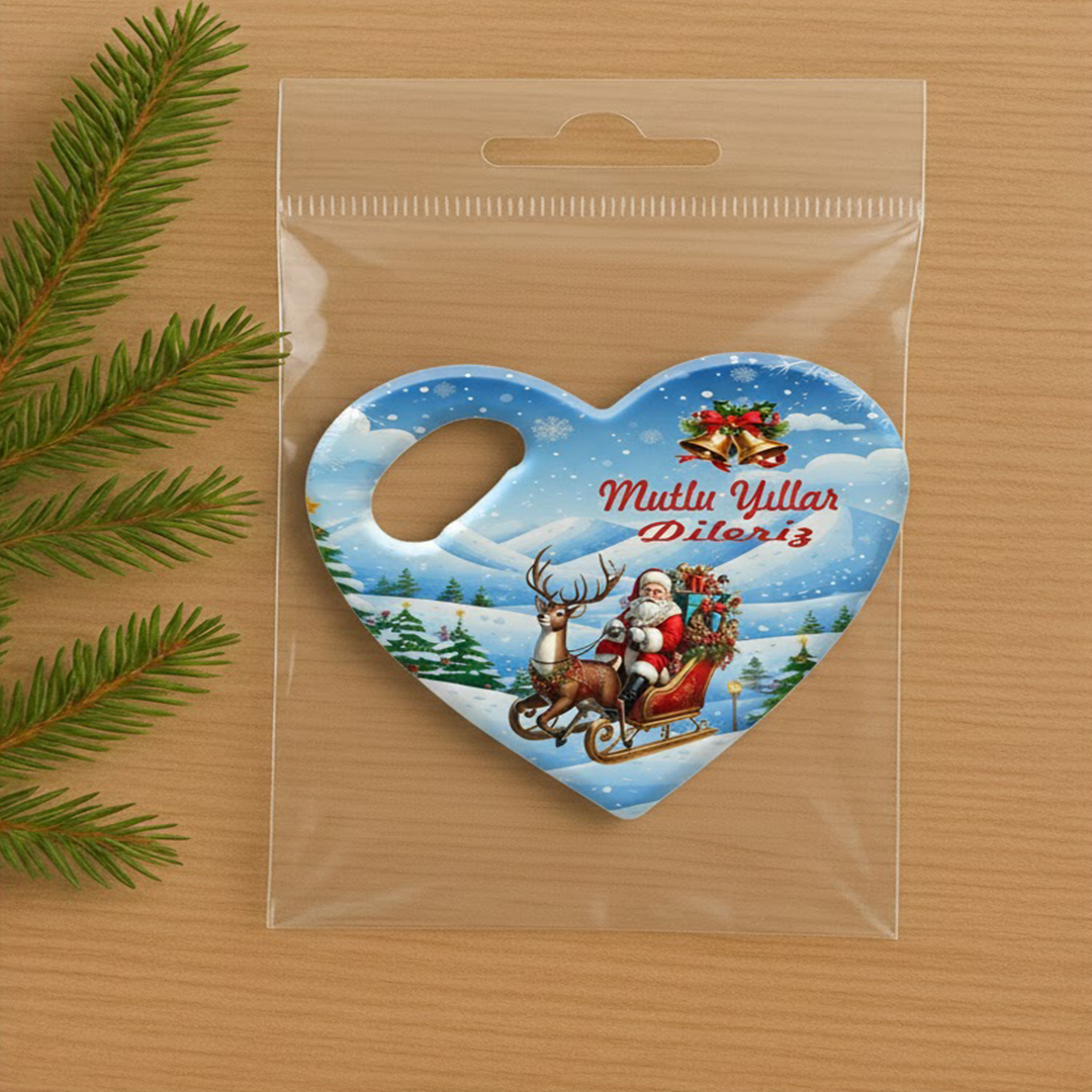 Sevdiklerinize küçük ama anlamlı bir hediye vermek ya da evinizde yılbaşı ruhunu her an hissetmek ister misiniz? “Mutlu Yıllar Dileriz” temalı, kalp formundaki bu özel tasarım magnet açacak, hem şıklığı hem de işlevselliği bir arada sunuyor.